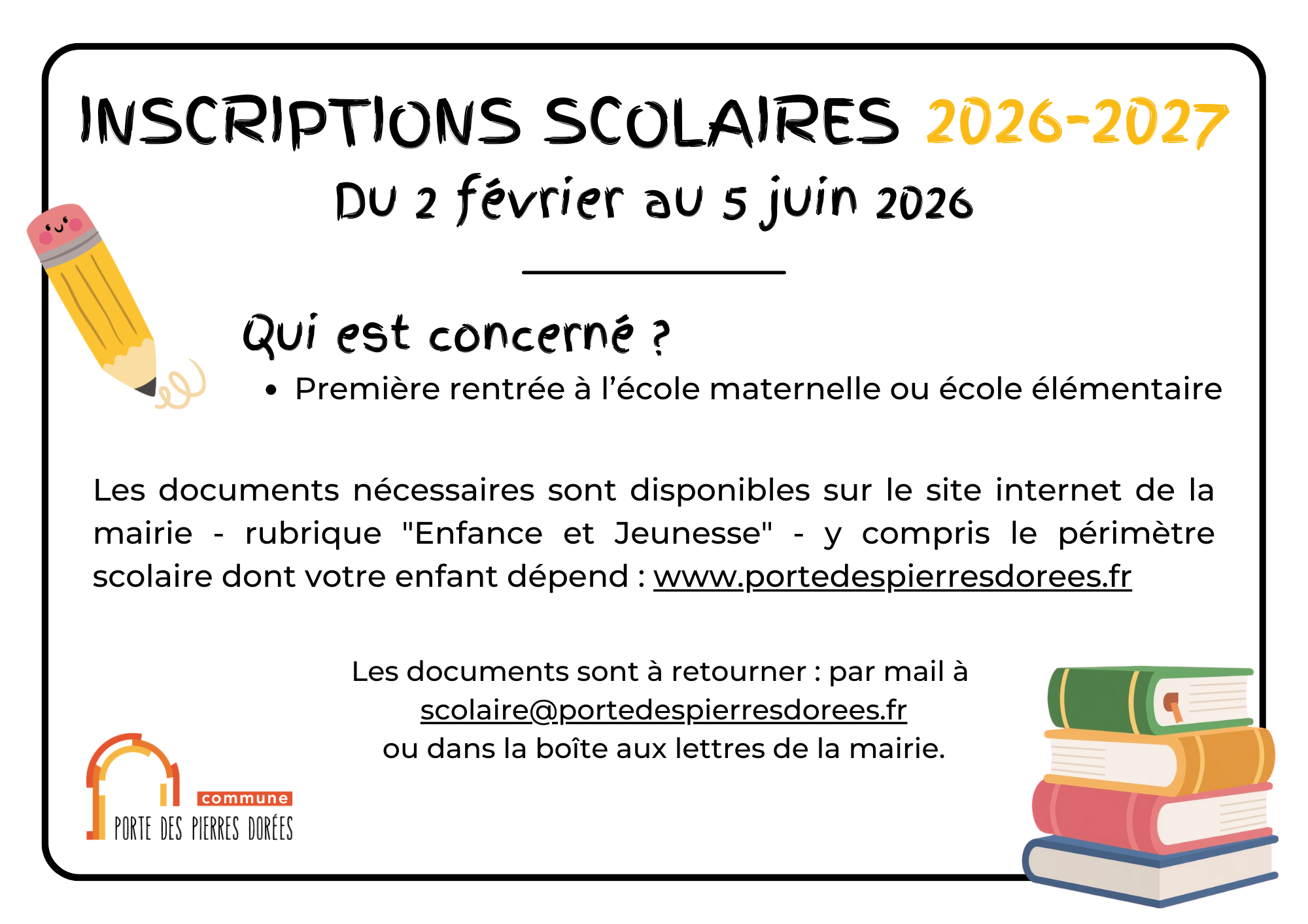 Votre enfant fera sa première rentrée à l’école maternelle ou élémentaire à la rentrée 2026 ? Les inscriptions scolaires sont ouvertes DU 2 FÉVRIER AU 5 JUIN 2026 !