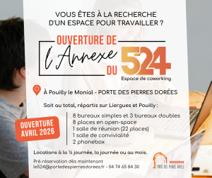 L’Annexe du 524 ouvrira ses portes en avril ! Vous cherchez un espace pour travailler ? Découvrez l’Annexe du 524, nouvel espace de coworking situé à Pouilly le Monial !